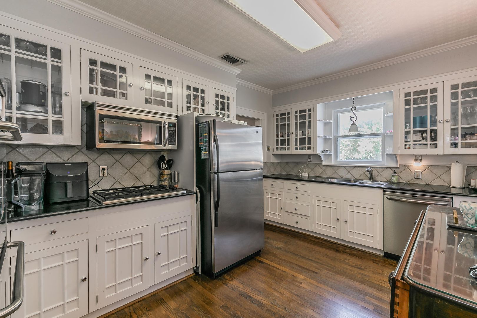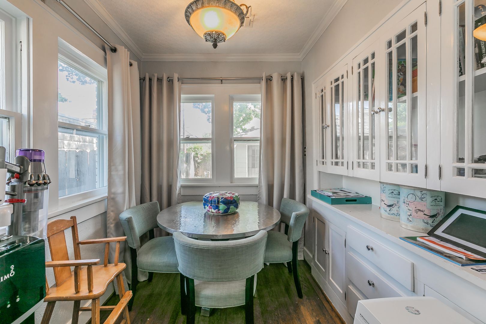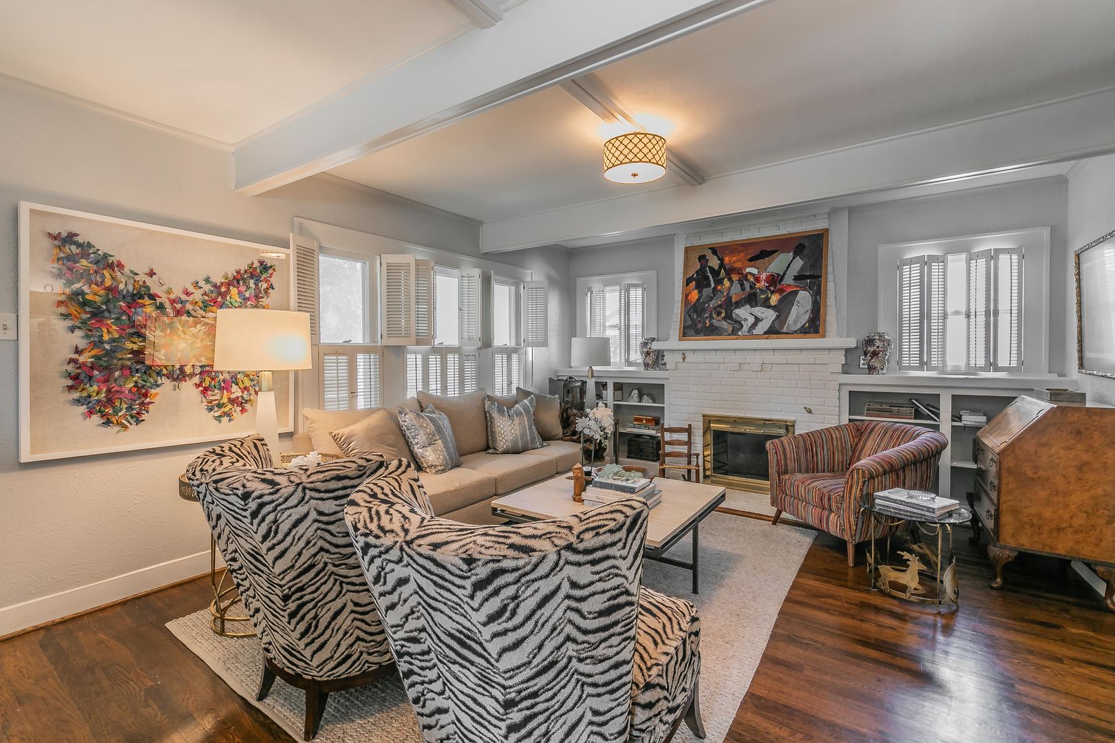 The formal dining area features built-in bookshelves and decorative lighting, while the kitchen nook showcases charming original built-ins. The inviting kitchen comes equipped with all appliances and flows seamlessly into a large living area with beautiful wooden shutters and updated light fixtures throughout.