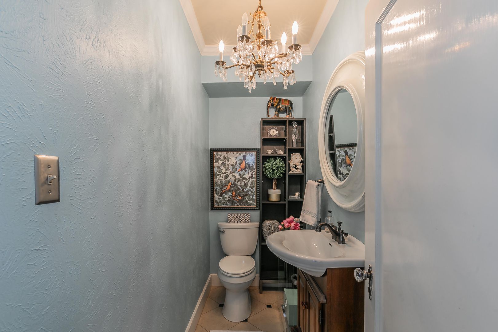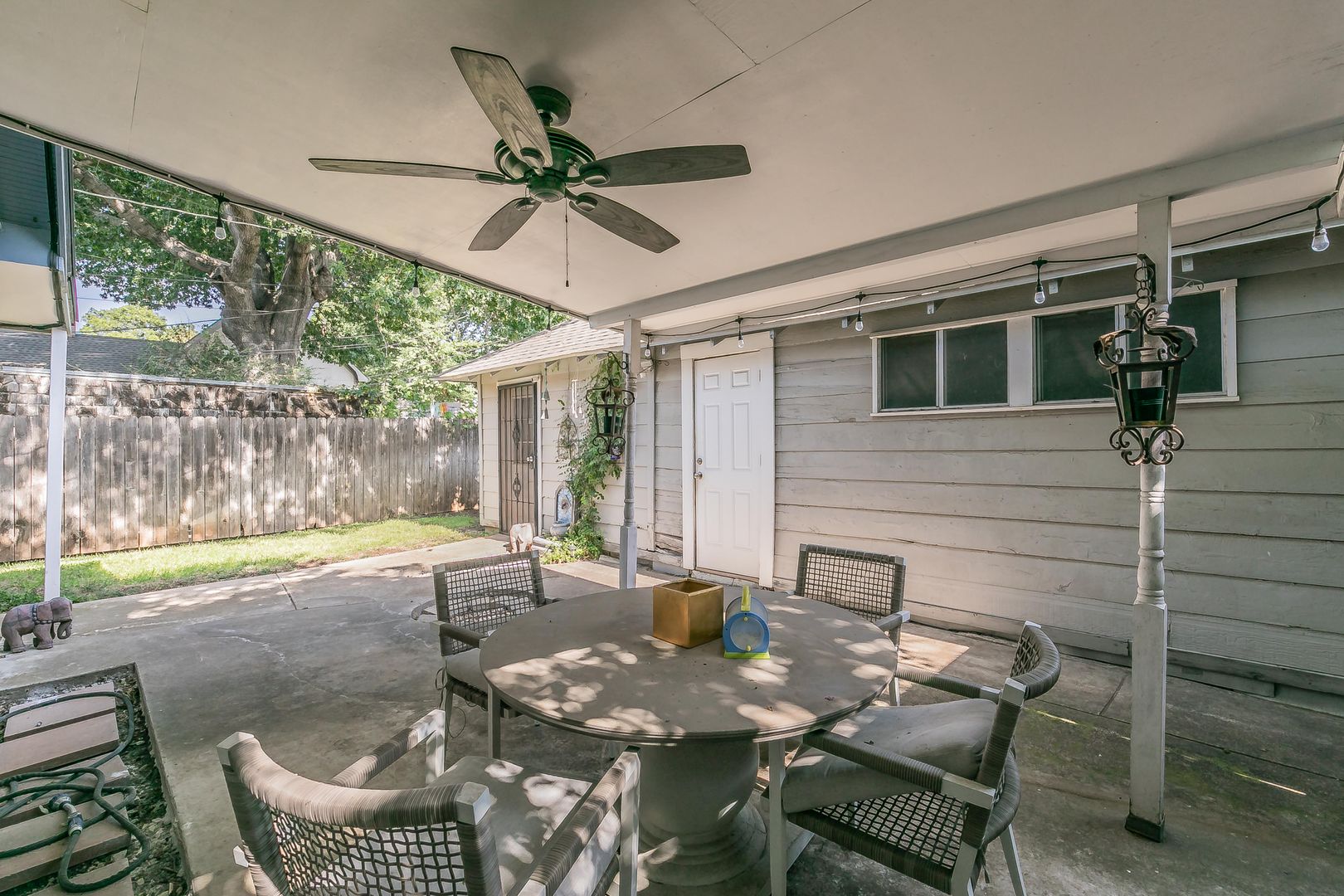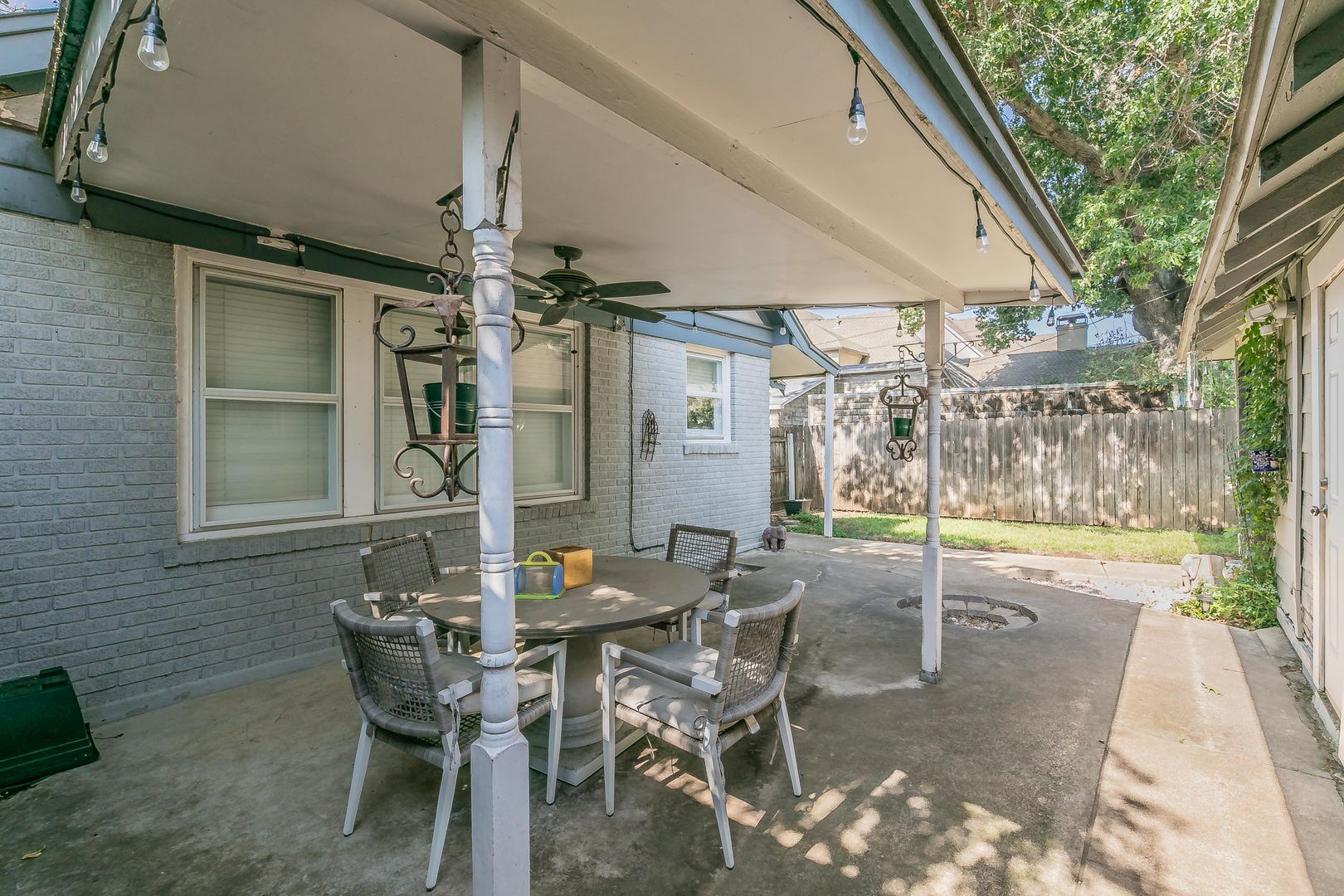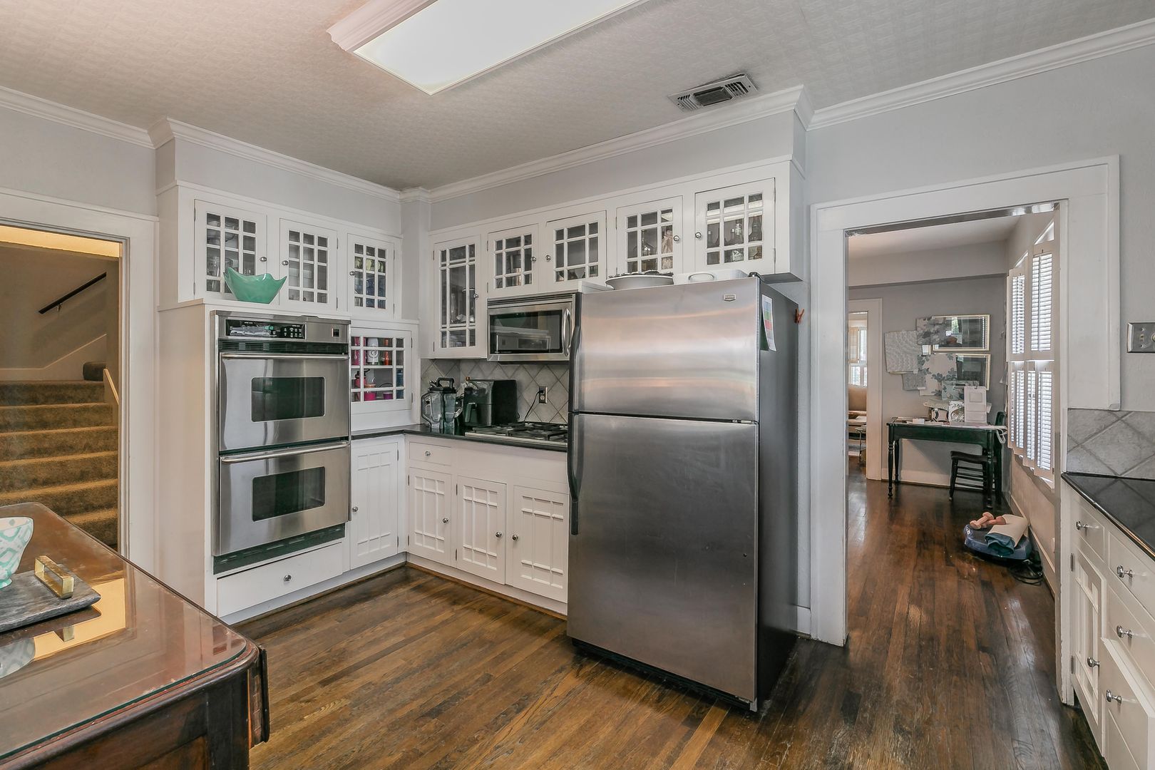 The formal dining area features built-in bookshelves and decorative lighting, while the kitchen nook showcases charming original built-ins. The inviting kitchen comes equipped with all appliances and flows seamlessly into a large living area with beautiful wooden shutters and updated light fixtures throughout.